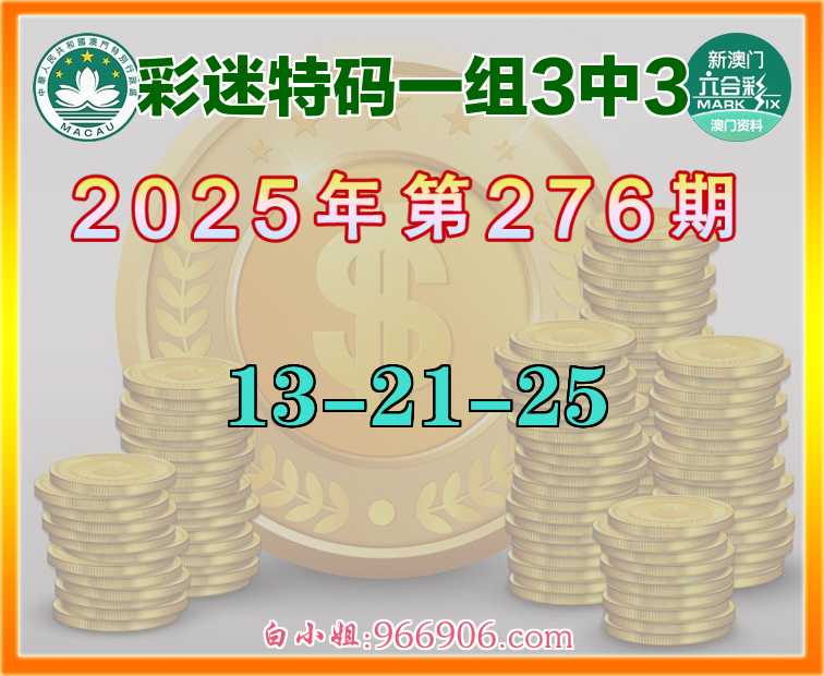 276期:《彩迷特码》 ♣️一组3中3♣️【13-21-25】
